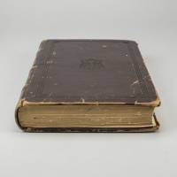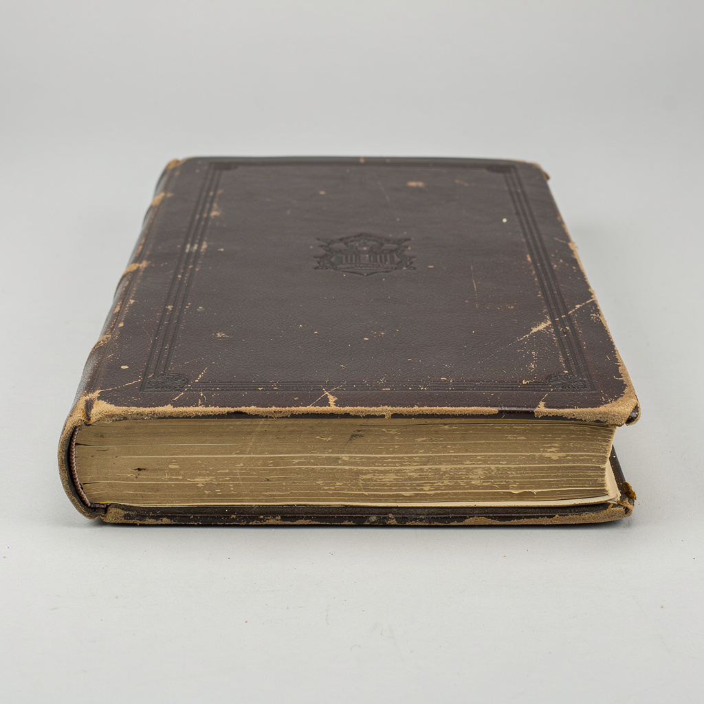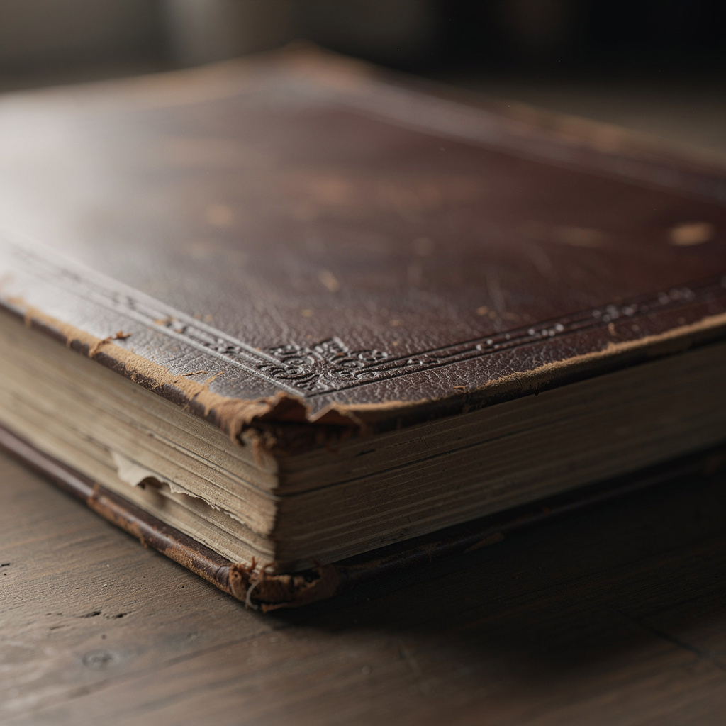 an old worn book with a thick leather cover, slightly weathered edges and visible page layers, simple embossed details on the cover, resting on a flat surface, closed, low angle shot, realistic materials, technical scan-like, flat even lighting, orthographic feel, high clarity, documentation style, minimal artistic interpretation
