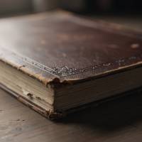 an old worn book with a thick leather cover, slightly weathered edges and visible page layers, simple embossed details on the cover, resting on a flat surface, closed, low angle shot, realistic materials, cinematographic, film still, shallow depth of field, natural color grading, soft directional light