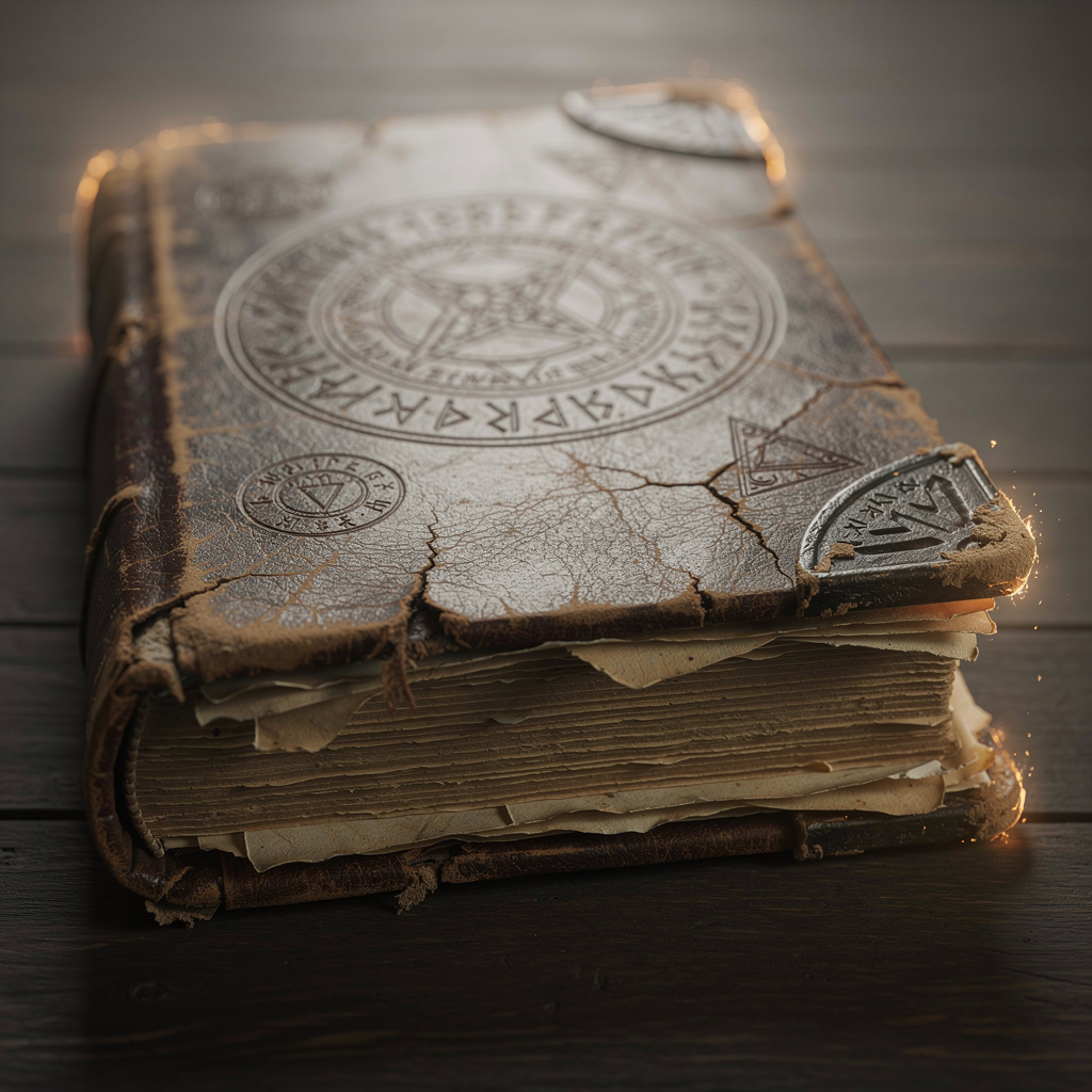 an old worn book with a thick leather cover, slightly weathered edges and visible page layers, simple embossed details on the cover, resting on a flat surface, closed, low angle shot, realistic materials, fantasy aesthetic, subtle magical atmosphere, faint arcane motifs, soft ambient glow, grounded realism