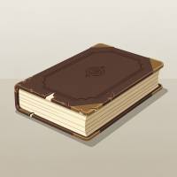 an old worn book with a thick leather cover, slightly weathered edges and visible page layers, simple embossed details on the cover, resting on a flat surface, closed, low angle shot, stylized illustration, clean shapes, simplified forms, controlled shading, crisp edges