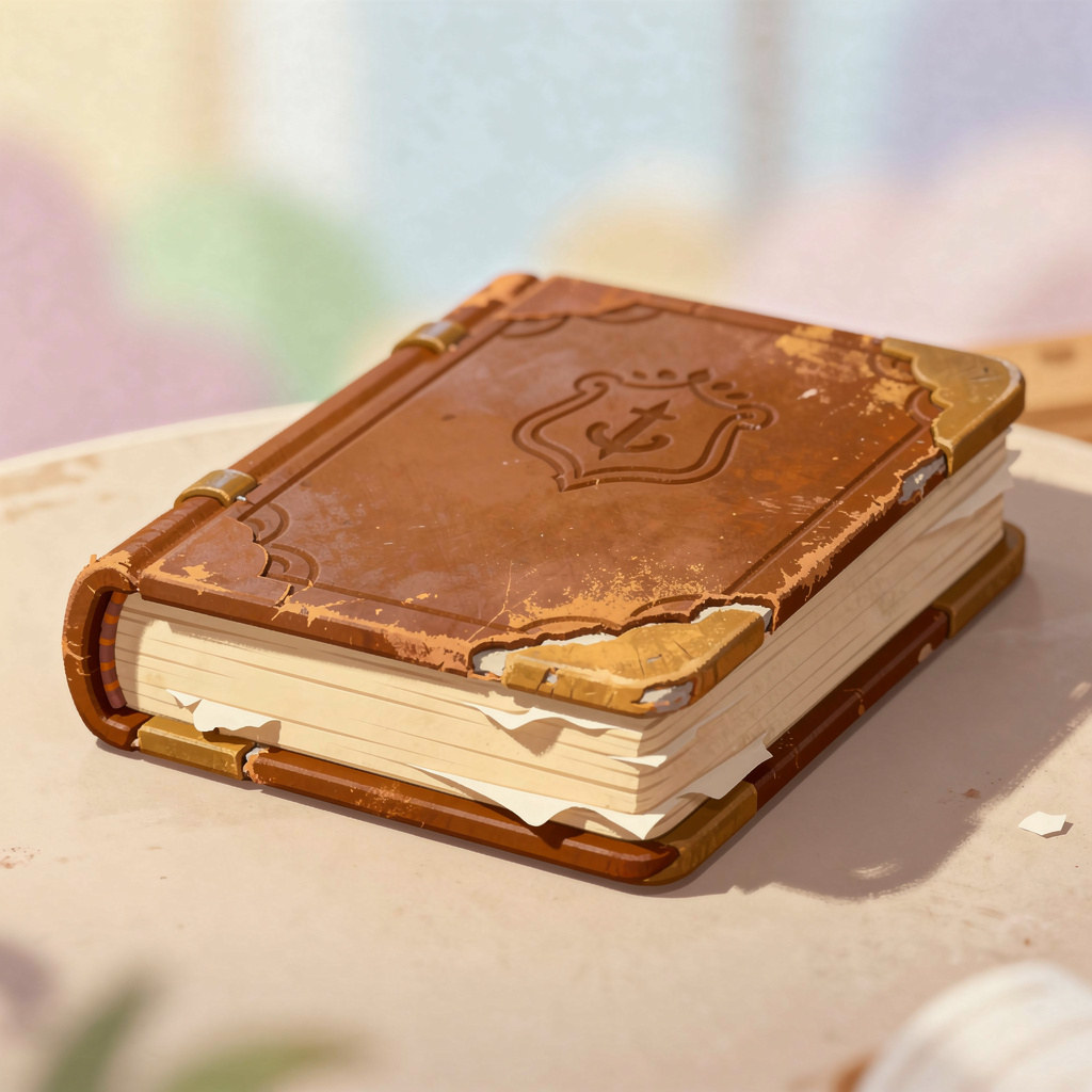 an old worn book with a thick leather cover, slightly weathered edges and visible page layers, simple embossed details on the cover, resting on a flat surface, closed, low angle shot, bright whimsical style, vibrant colors, soft rounded forms, playful atmosphere, light and airy mood
