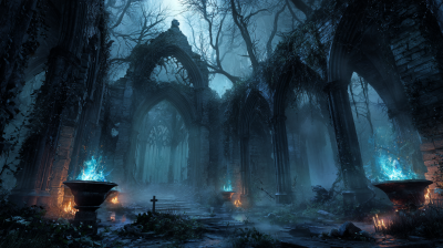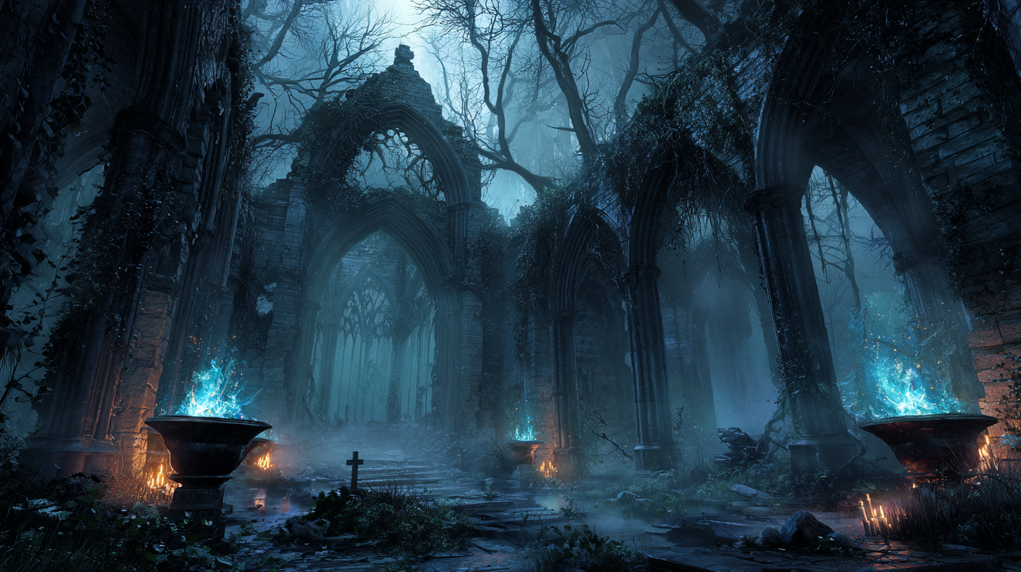ancient ruined cathedral deep in a haunted forest, black stone arches covered in vines, ghostly blue flames burning in iron braziers, thick fog creeping through the ruins, dark fantasy, moody cinematic lighting, mysterious atmosphere