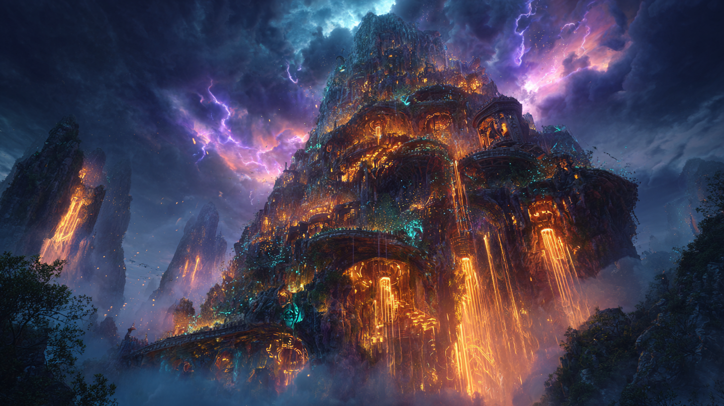 ancient wizard citadel carved into a mountain, floating runes and glowing magical waterfalls, storm clouds swirling above, epic fantasy concept art, volumetric lighting, intricate architecture, ultra detailed --ar 16:9