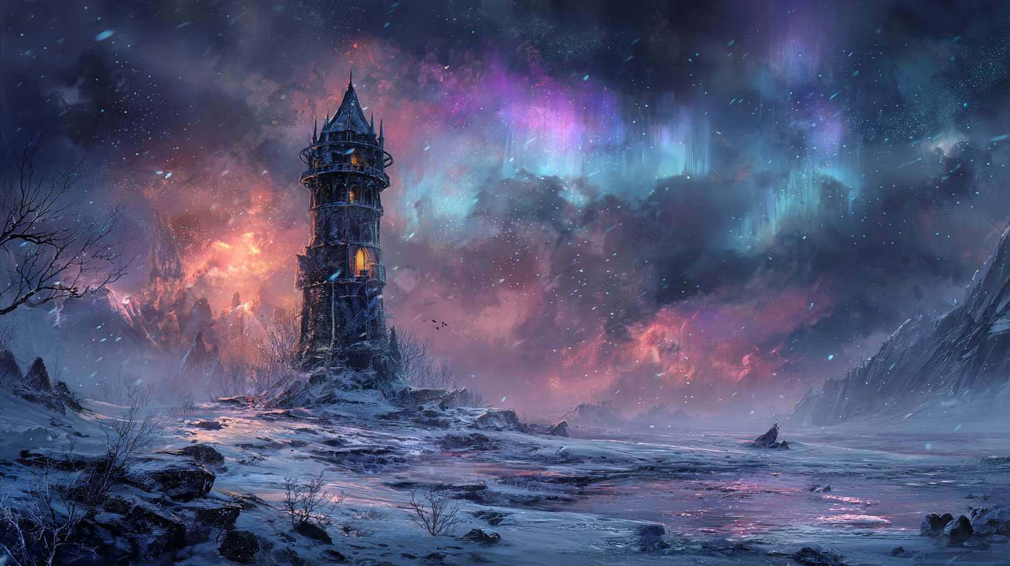 ancient wizard tower in the middle of a frozen wasteland, aurora borealis illuminating the night sky, snow drifting through the air, lonely magical atmosphere, mysterious epic fantasy mood --ar 16:9