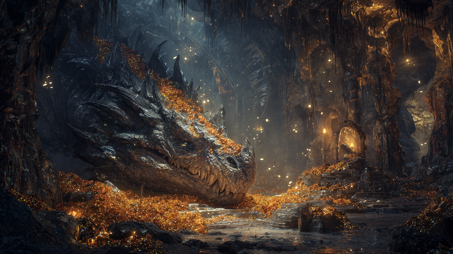 colossal ancient dragon sleeping on a mountain of treasure, inside a vast underground dwarven hall conquered and abandoned, river streaks of gold illuminating the cave walls, embers drifting in the air, epic fantasy, cinematic lighting, ultra detailed --ar 16:9