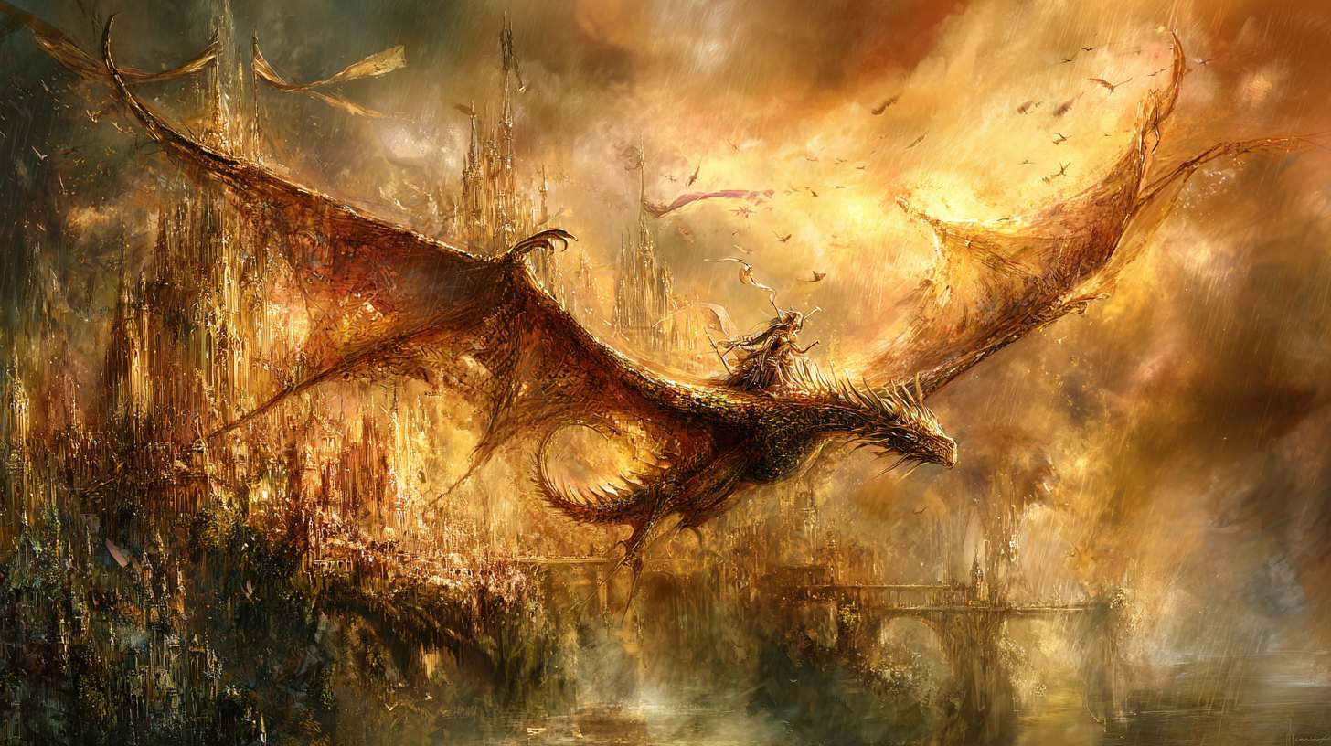 dragon rider soaring above a golden medieval city, banner flags waving from marble towers, dramatic sunset sky, epic fantasy painting, oil painting style, rich colors, masterwork fantasy illustration