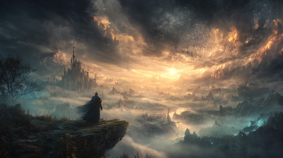 lone mage standing on a cliff overlooking a vast misty kingdom, wisdom, ancient castles and rivers below, golden sunrise breaking through clouds, cinematic wide shot, epic atmosphere, dramatic lighting, ultra detailed --ar 16:9
