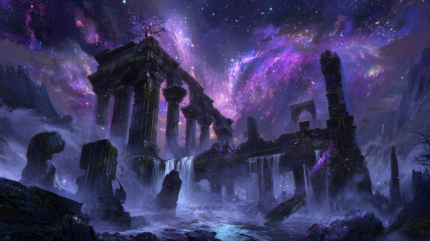 massive forgotten temple of a lost god, floating in deep space, stone pillars orbiting the ruins, ancient runes glowing faintly, waterfalls pouring from broken towers, mist rising through the scenery, mystical stars and galaxy formations in the background, epic fantasy environment, majestic scale --ar 16:9