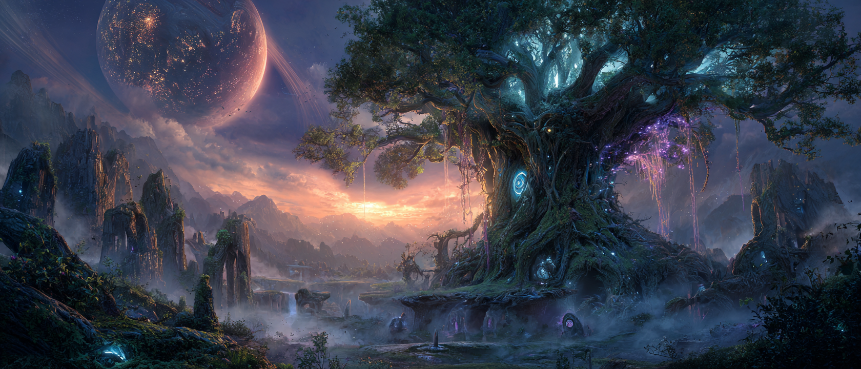 vast enchanted forest valley, gigantic ancient trees covered in glowing runes, huge ring-planets close in sky, hidden elven ruins beneath the roots, aerial shot, soft twilight fog drifting through the valley, mystical atmosphere, epic fantasy landscape --ar 21:9