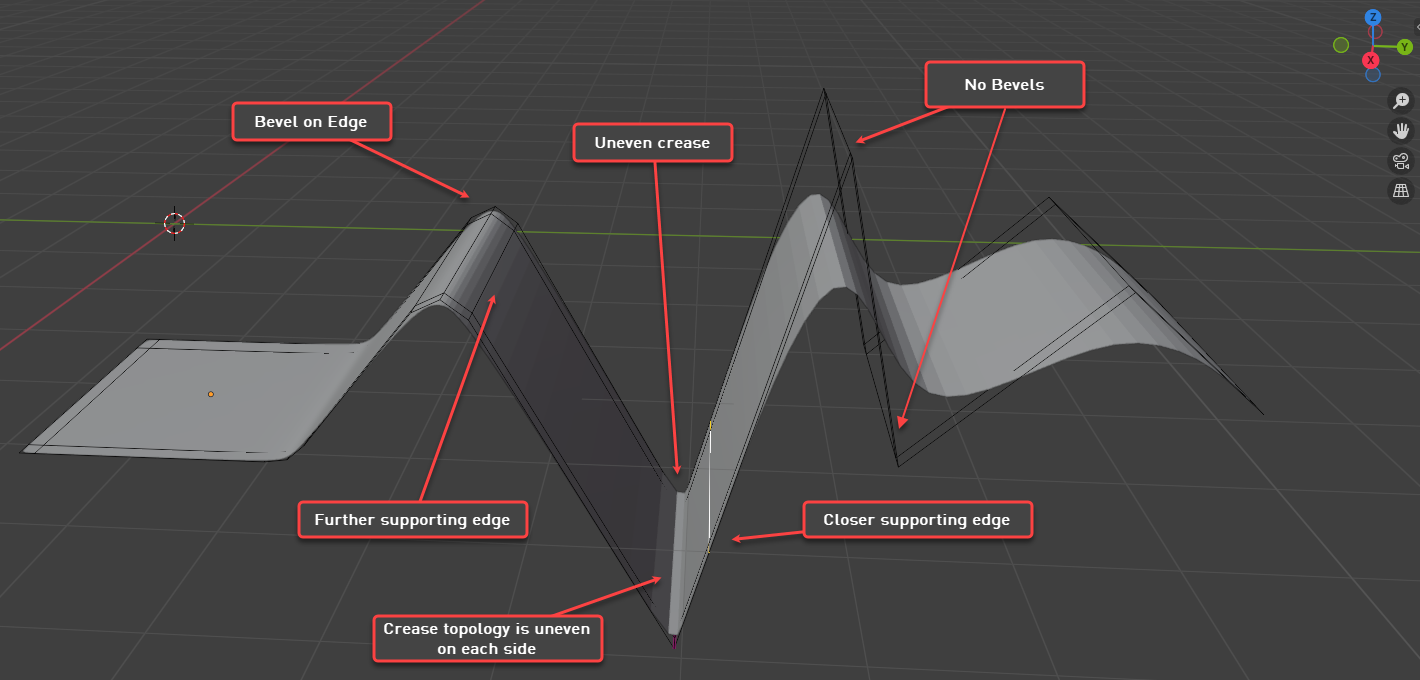 Crease imitates the presence of supporting loops without adding topology but can create uneven topology if the adjacent edges are not at equal distance from creased edge.
