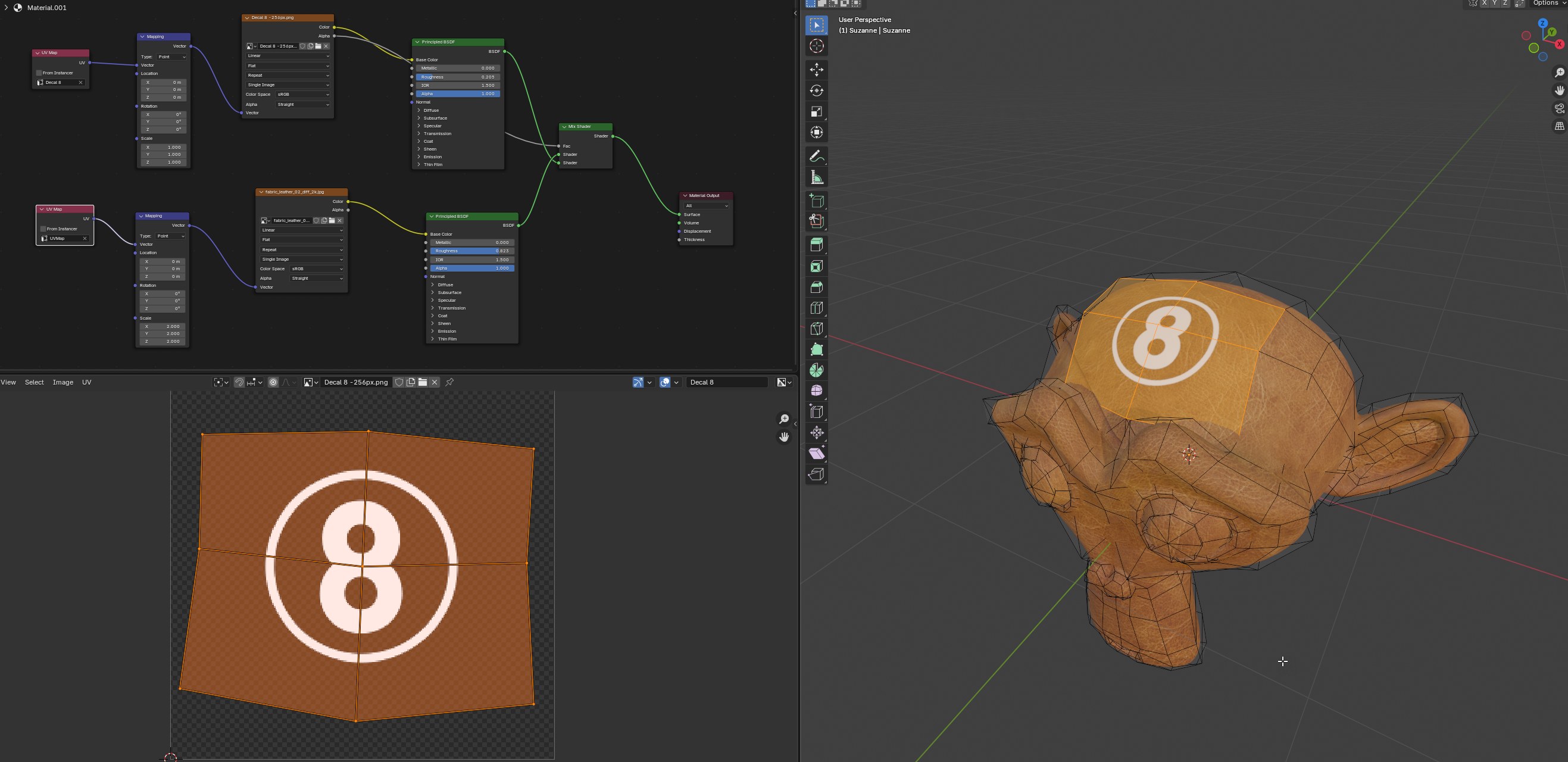 With the object selected, in the Data property panel, under UV Maps, add a second UV Map. Rename it decal and use it as the UV Map for the Vector coordinates of the mapping on the decal texture.